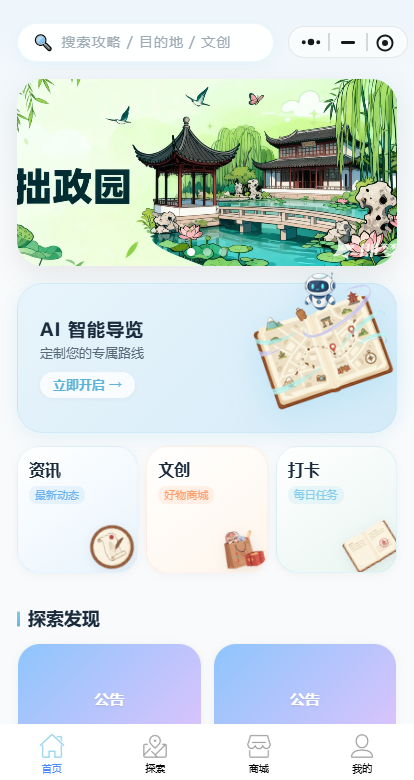 我们做了一款小程序叫云游智创,专为大学生打造的旅游社交平台,核心功能集地图打卡、文创商店、旅游分享、结伴同行于一体,让每一位大学生都能在旅行中认识新朋友、发现新文化、创造新回忆,打造属于 Z 世代的旅行社交新生态。
