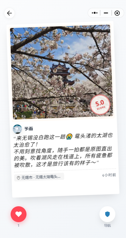 核心亮点:基于定位的景点 / 小众打卡点聚合,支持一键导航 + 打卡标记,还能显示周边热门点位(如截图中 “相王庙”“桂花公园” 等点位的距离、导航功能),契合年轻人 “打卡晒足迹” 的旅游习惯。